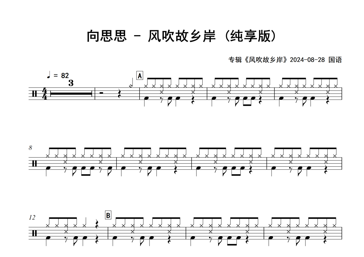 《风吹故乡岸 (纯享版)》是向思思演唱的一首歌曲,专辑版,拍号为4/4拍,歌曲速度为每分钟82拍,这份架子鼓谱共有两张高清图谱,图谱由 @Sawubona 编配上传,图谱使用五线谱编配,使用这份风吹故乡岸 (纯享版)架子鼓谱,你将能够轻松地敲打出这首向思思的风吹故乡岸 (纯享版),快来尝试吧。