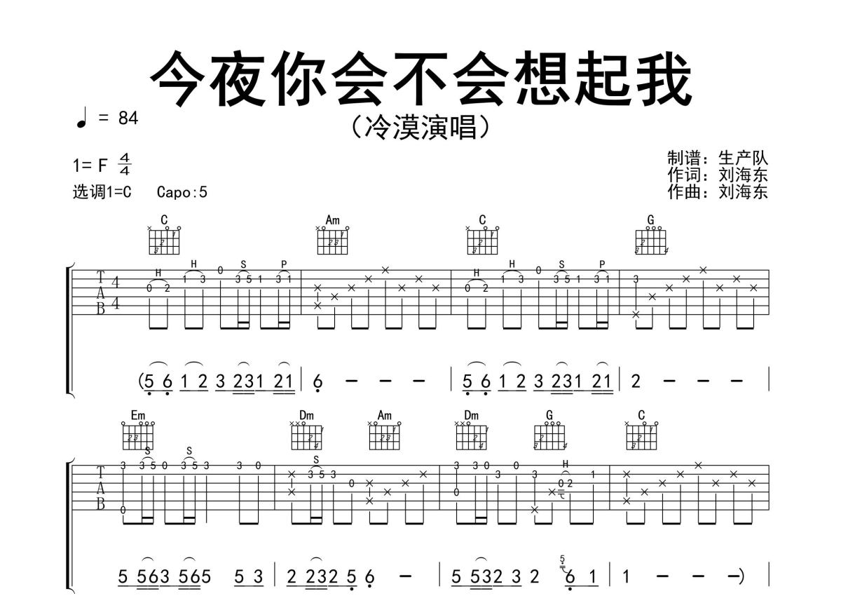 《今夜你会不会想起我》是冷漠演唱的一首歌曲,精编完美版,拍号为4/4拍,歌曲速度为每分钟84拍,歌曲原调为F调,但由于原调指法比较难,为了方便弹奏,本吉他谱采用的是C调指法编配,变调夹5品弹奏即为原调,当然也可以根据自己的音域改变变调夹位置,或者通过改变和弦调性,以方便自己弹奏,这份吉他谱共有三张高清图谱,图谱由 @生产队 编配上传,图谱使用六线谱编配,包含吉他和弦指法、简谱以及歌词部分,使用这份今夜你会不会想起我吉他谱,可以让你更加方便地掌握这首歌曲的弹唱技巧,快来尝试吧。冷漠演唱的经典歌曲《今夜你会不会想起我》原版吉他谱,精准的前奏、间奏solo编配。