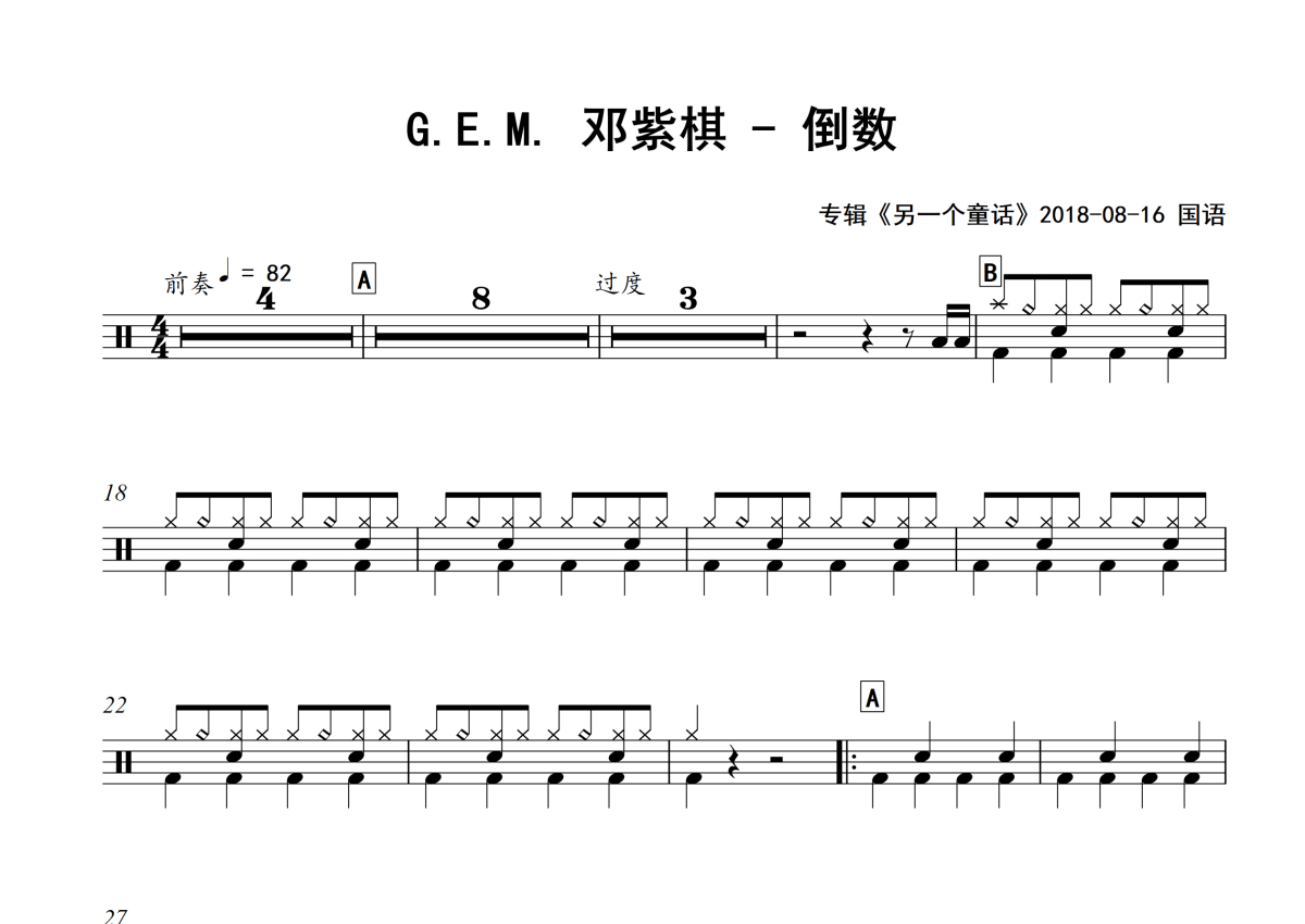 G.E.M. 邓紫棋《倒数》架子鼓谱 - 专辑版