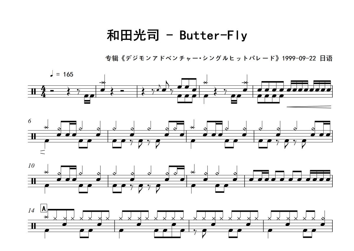 《Butter-Fly》是和田光司演唱的一首歌曲,专辑版,拍号为4/4拍,歌曲速度为每分钟165拍,这份架子鼓谱共有四张高清图谱,图谱由 @积极处世 编配上传,图谱使用五线谱编配,使用这份Butter-Fly架子鼓谱,你将能够轻松地敲打出这首和田光司的Butter-Fly,快来尝试吧。