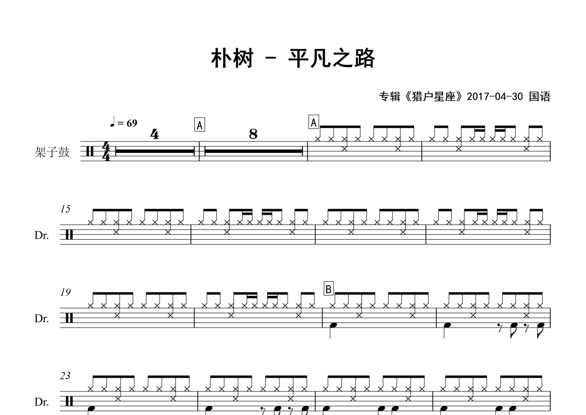 《平凡之路》是朴树演唱的一首歌曲,专辑版,拍号为4/4拍,歌曲速度为每分钟69拍,这份架子鼓谱共有三张高清图谱,图谱由 @举个例子 编配上传,图谱使用五线谱编配,使用这份平凡之路架子鼓谱,你将能够轻松地敲打出这首朴树的平凡之路,快来尝试吧。