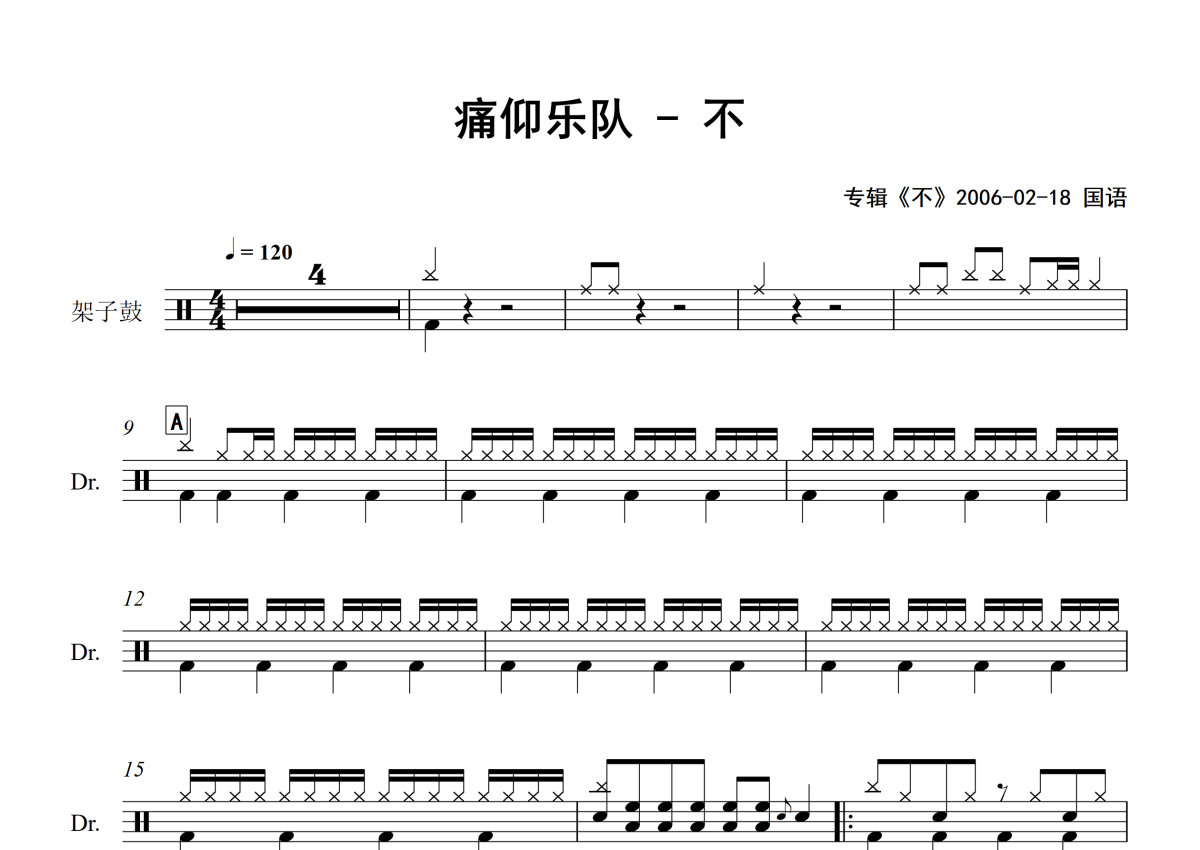 《不》是痛仰乐队演唱的一首歌曲,专辑版,拍号为4/4拍,歌曲速度为每分钟120拍,这份架子鼓谱共有三张高清图谱,图谱由 @Sawubona 编配上传,图谱使用五线谱编配,使用这份不架子鼓谱,你将能够轻松地敲打出这首痛仰乐队的不,快来尝试吧。