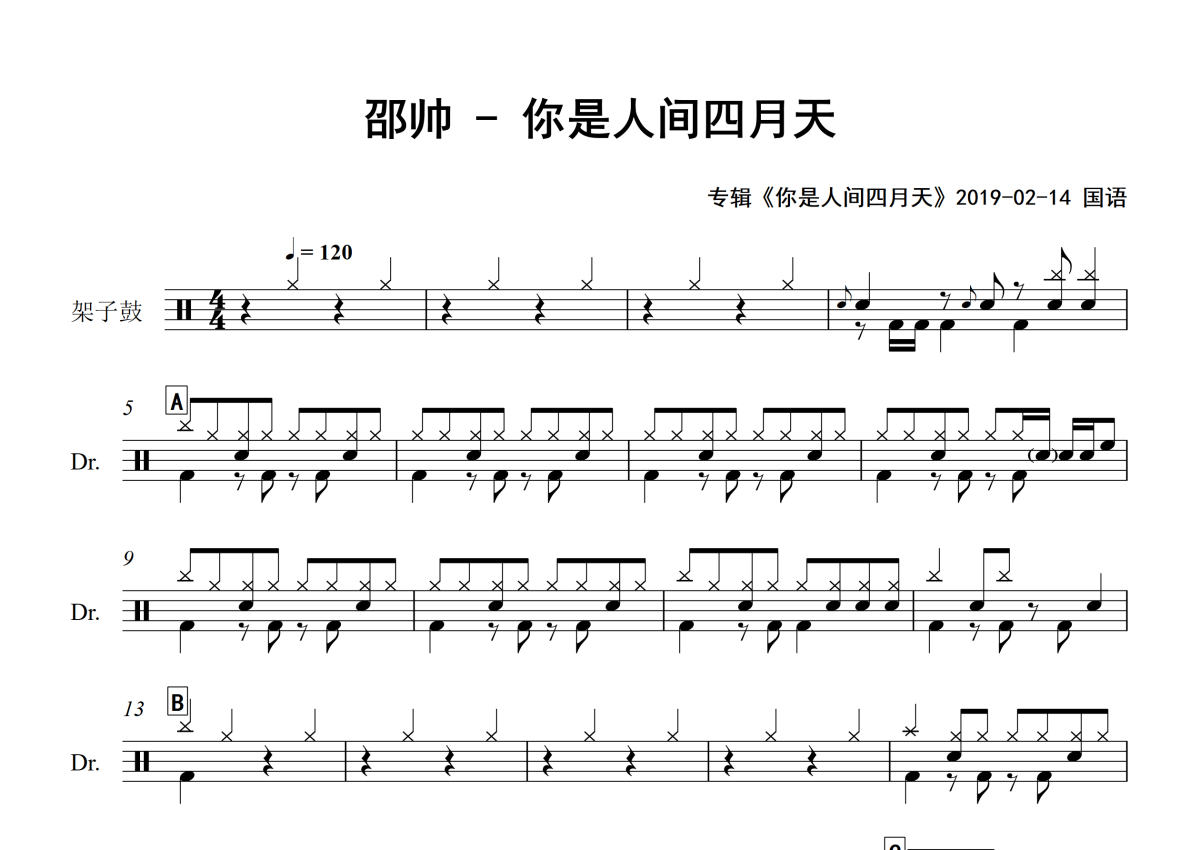 邵帅《你是人间四月天》架子鼓谱 - 专辑版