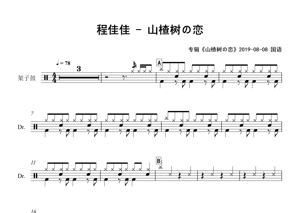 《山楂树の恋》是程佳佳演唱的一首歌曲,专辑版,拍号为4/4拍,歌曲速度为每分钟78拍,这份架子鼓谱共有两张高清图谱,图谱由 @Sawubona 编配上传,图谱使用五线谱编配,使用这份山楂树の恋架子鼓谱,你将能够轻松地敲打出这首程佳佳的山楂树の恋,快来尝试吧。