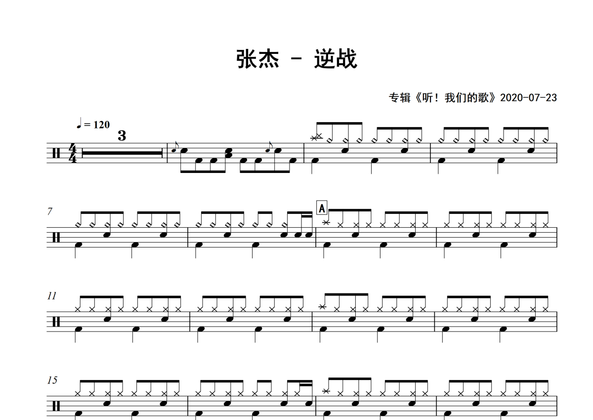 《逆战》是张杰演唱的一首歌曲,专辑版,拍号为4/4拍,歌曲速度为每分钟120拍,这份架子鼓谱共有三张高清图谱,图谱由 @举个例子 编配上传,图谱使用五线谱编配,使用这份逆战架子鼓谱,你将能够轻松地敲打出这首张杰的逆战,快来尝试吧。