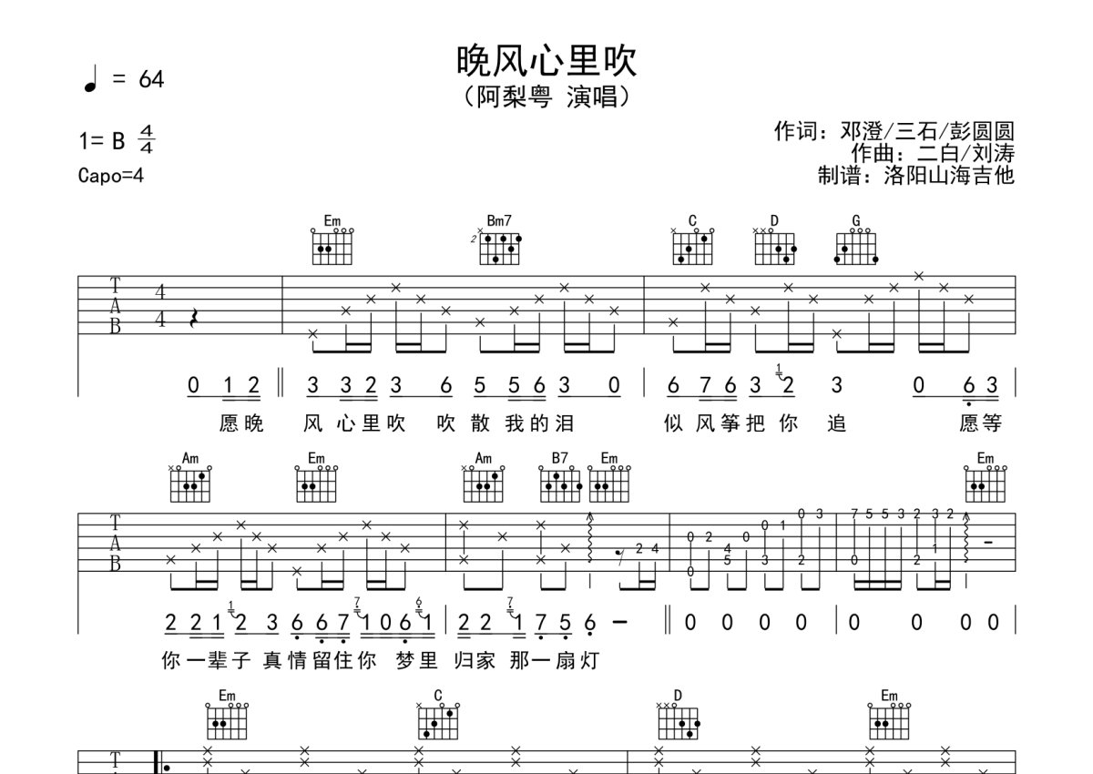 《晚风心里吹》是阿梨粤演唱的一首歌曲,本吉他谱采用的是G调指法编配,这份吉他谱共有两张高清图谱,图谱由 @何奔洋 编配上传,图谱使用六线谱编配,包含吉他和弦指法、简谱以及歌词部分,曲谱配备了相关的音频提供试听,使用这份晚风心里吹吉他谱,可以让你更加方便地掌握这首歌曲的弹唱技巧,快来尝试吧。
