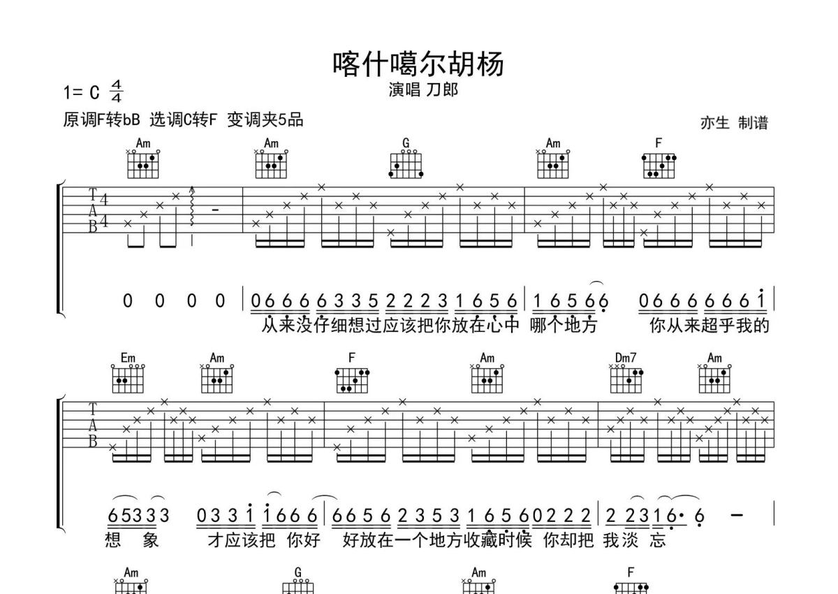 刀郎《喀什噶尔胡杨》吉他谱 - C调弹唱六线谱