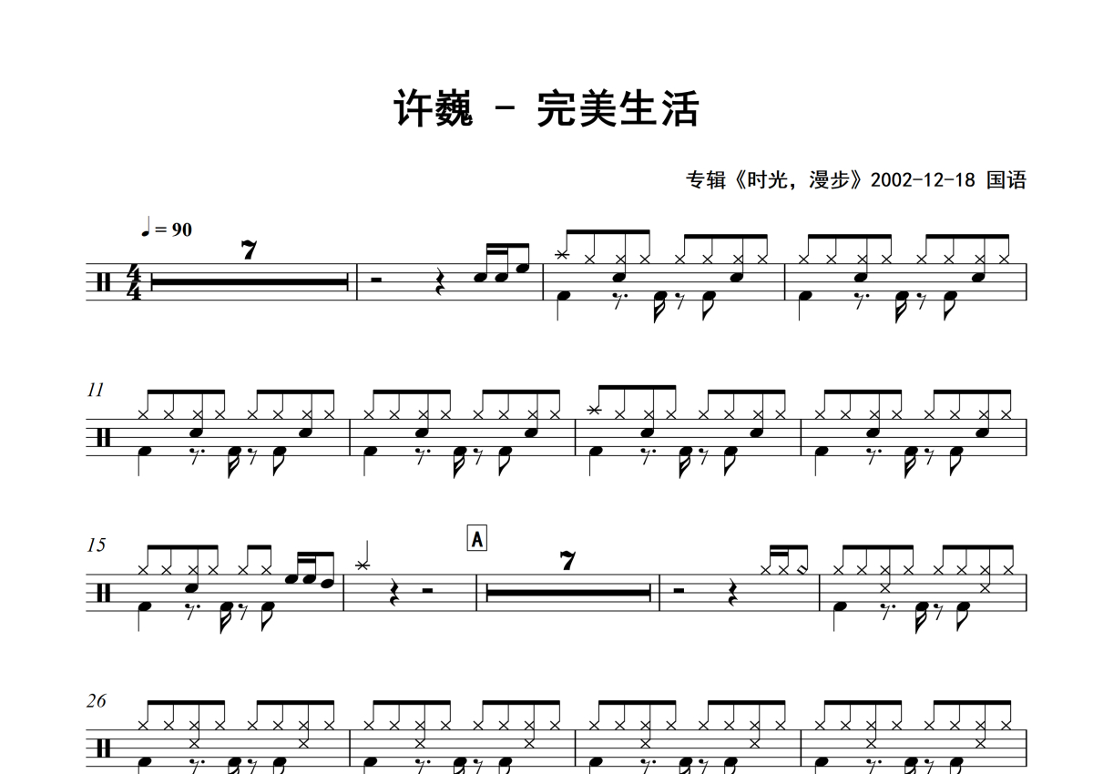 《完美生活》是许巍演唱的一首歌曲,专辑版,拍号为4/4拍,歌曲速度为每分钟90拍,这份架子鼓谱共有三张高清图谱,图谱由 @Sawubona 编配上传,图谱使用五线谱编配,使用这份完美生活架子鼓谱,你将能够轻松地敲打出这首许巍的完美生活,快来尝试吧。