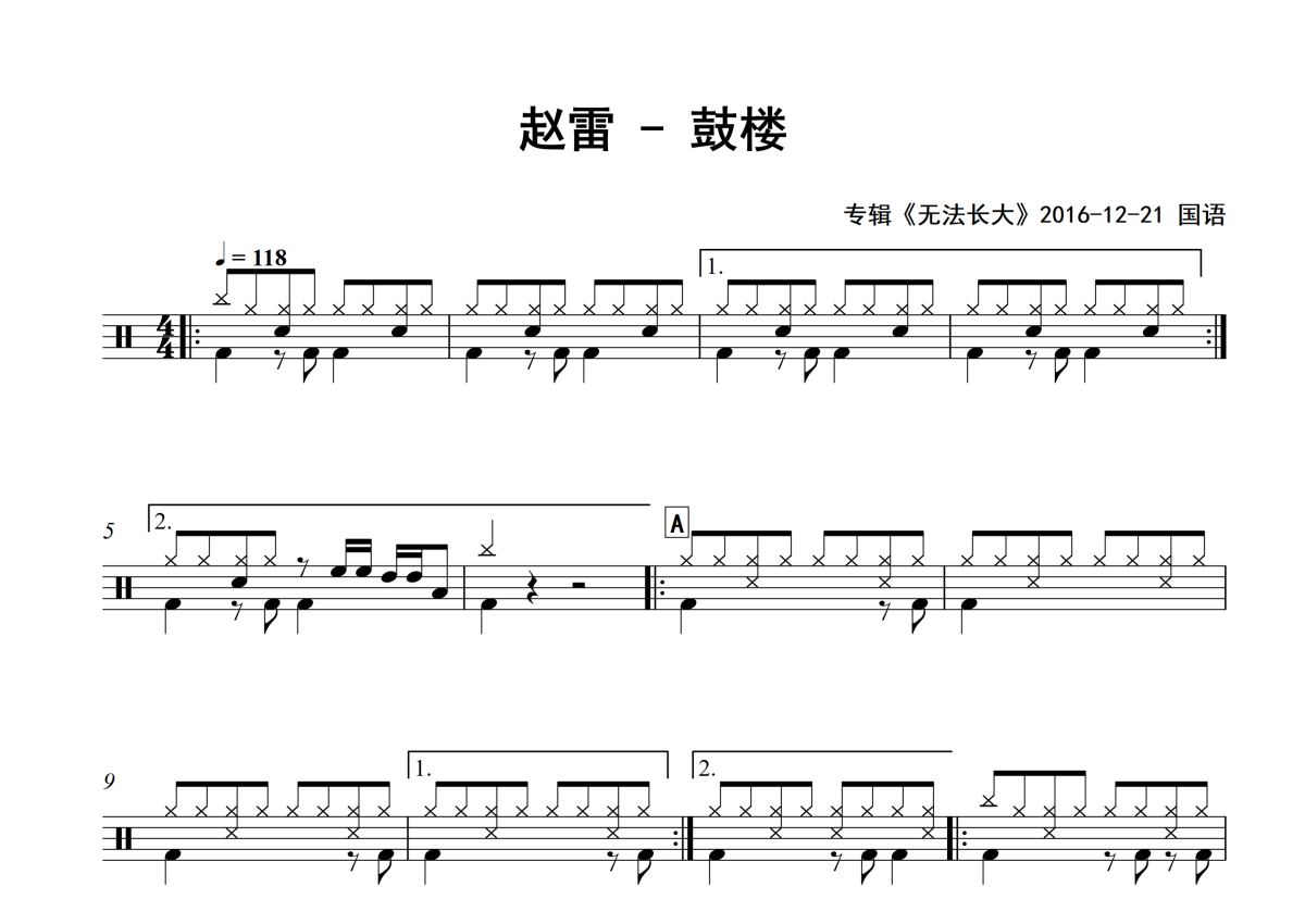 赵雷《鼓楼》架子鼓谱 - 专辑版