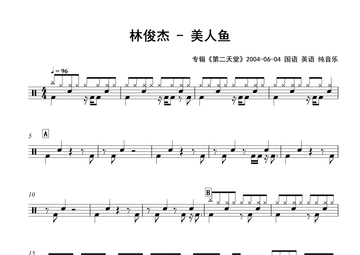 《美人鱼》是林俊杰演唱的一首歌曲,专辑版,拍号为4/4拍,歌曲速度为每分钟96拍,这份架子鼓谱共有两张高清图谱,图谱由 @Sawubona 编配上传,图谱使用五线谱编配,使用这份美人鱼架子鼓谱,你将能够轻松地敲打出这首林俊杰的美人鱼,快来尝试吧。