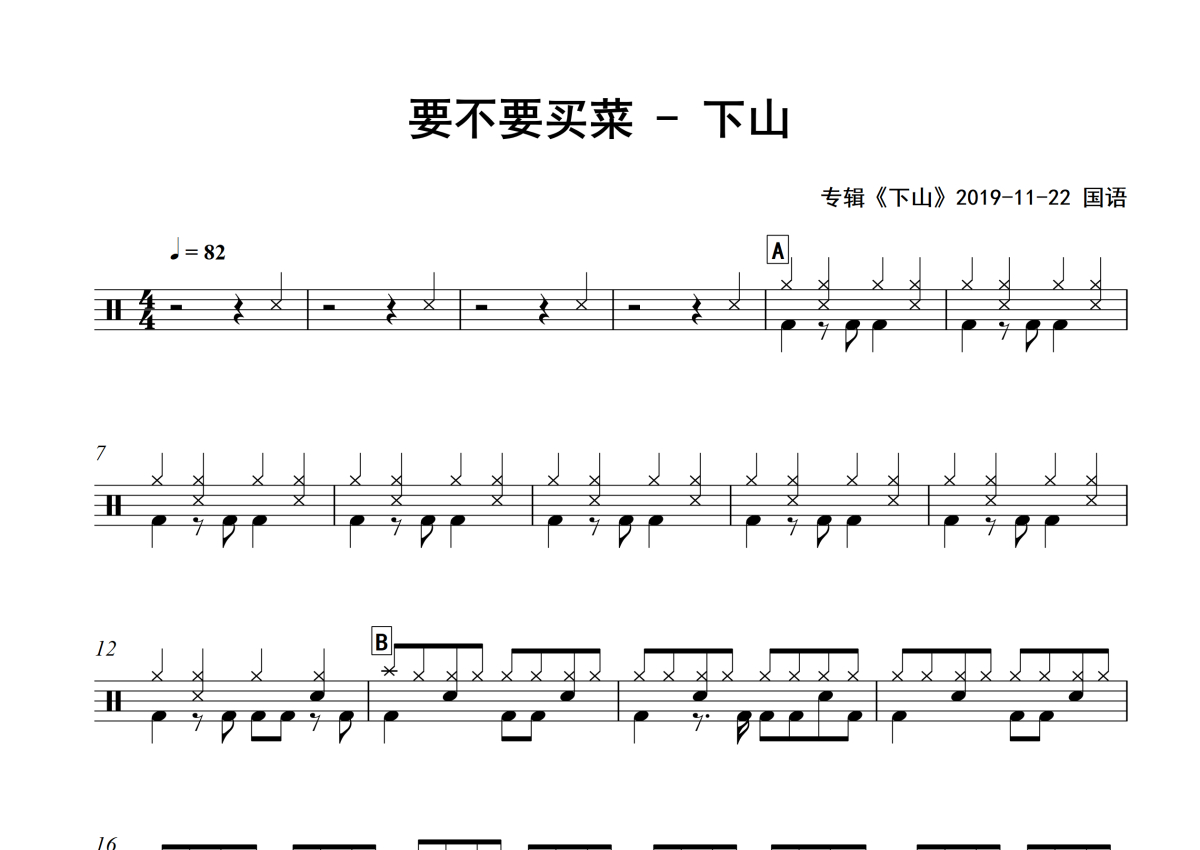 《下山》是要不要买菜演唱的一首歌曲,专辑版,拍号为4/4拍,歌曲速度为每分钟82拍,这份架子鼓谱共有两张高清图谱,图谱由 @Sawubona 编配上传,图谱使用五线谱编配,使用这份下山架子鼓谱,你将能够轻松地敲打出这首要不要买菜的下山,快来尝试吧。