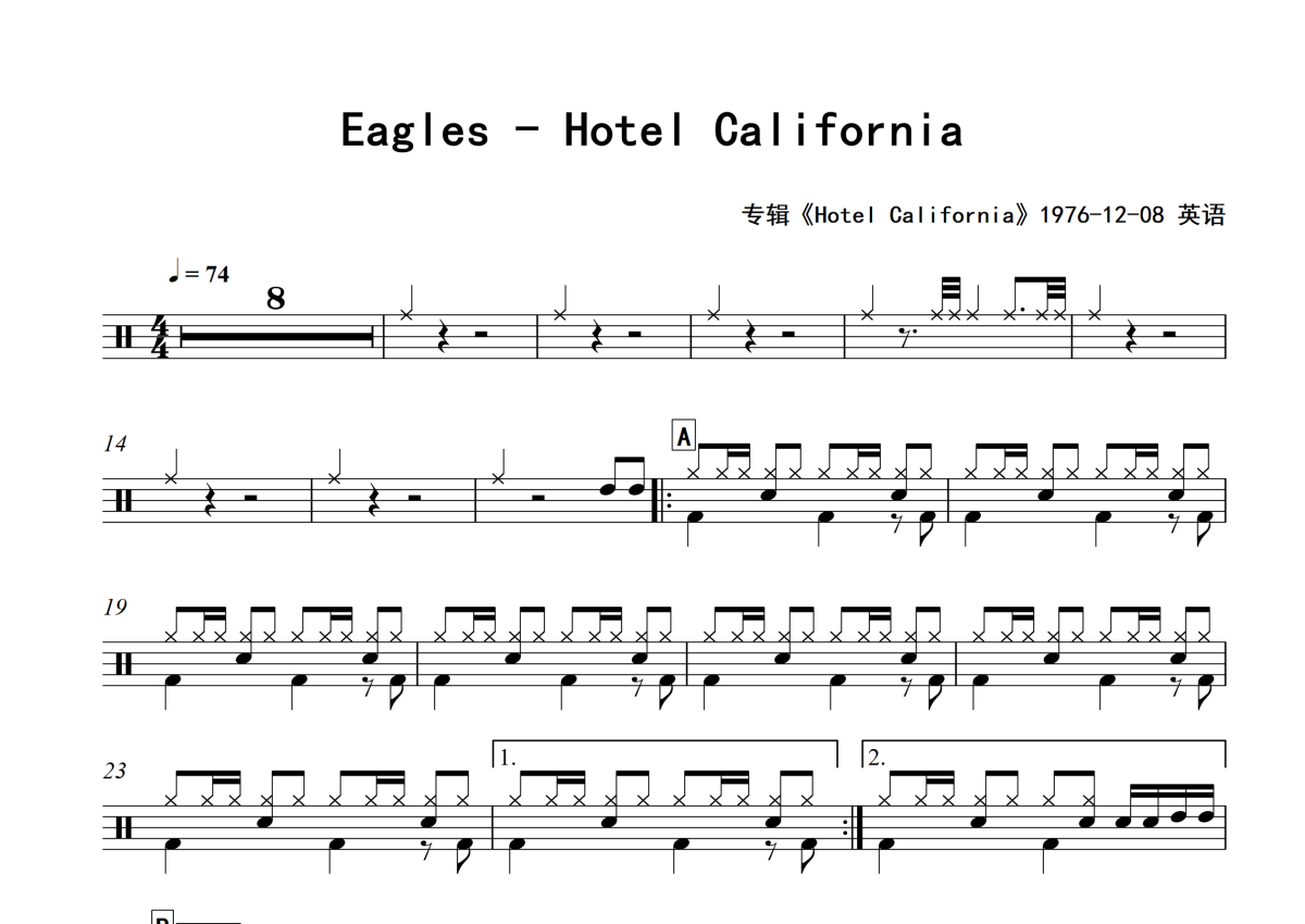 Eagles《Hotel California》架子鼓谱 - 专辑版