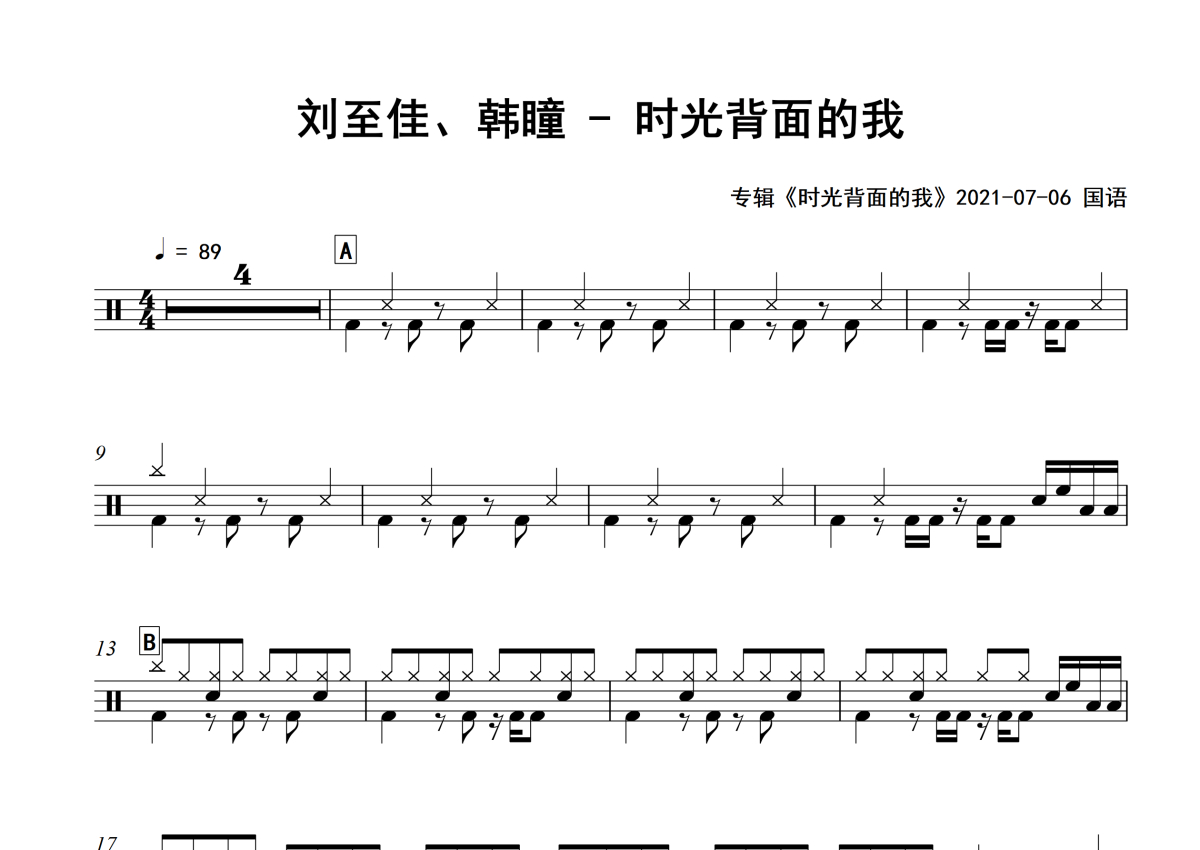 《时光背面的我》是刘至佳、韩瞳演唱的一首歌曲,专辑版,拍号为4/4拍,歌曲速度为每分钟89拍,这份架子鼓谱共有两张高清图谱,图谱由 @积极处世 编配上传,图谱使用五线谱编配,使用这份时光背面的我架子鼓谱,你将能够轻松地敲打出这首刘至佳、韩瞳的时光背面的我,快来尝试吧。