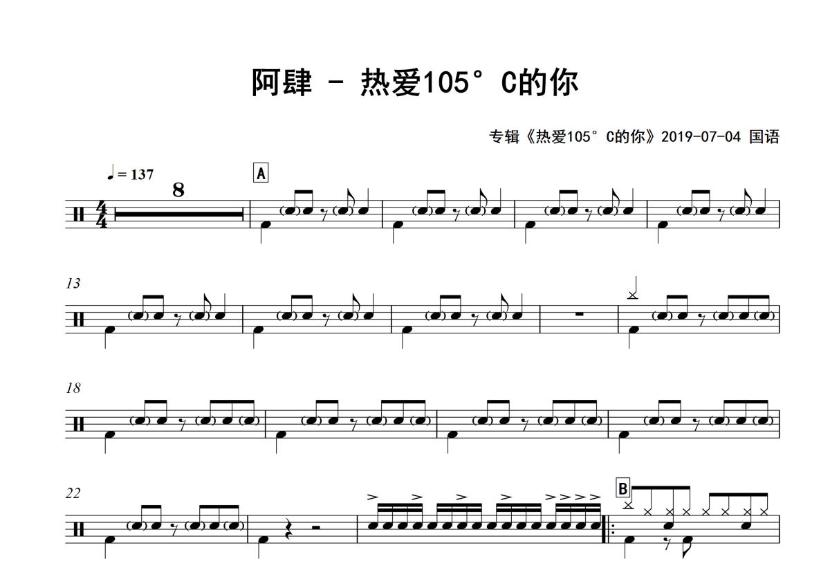 阿肆《热爱105°C的你》架子鼓谱 - 专辑版