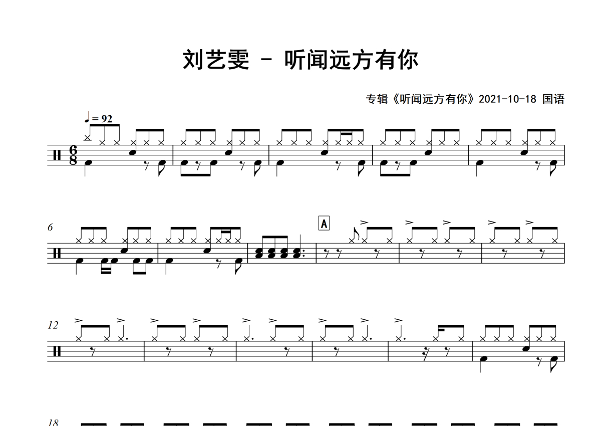 刘艺雯《听闻远方有你》架子鼓谱 - 专辑版