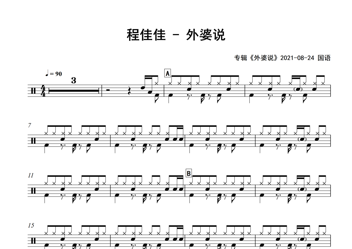 《外婆说》是程佳佳演唱的一首歌曲,专辑版,拍号为4/4拍,歌曲速度为每分钟90拍,这份架子鼓谱共有两张高清图谱,图谱由 @举个例子 编配上传,图谱使用五线谱编配,使用这份外婆说架子鼓谱,你将能够轻松地敲打出这首程佳佳的外婆说,快来尝试吧。