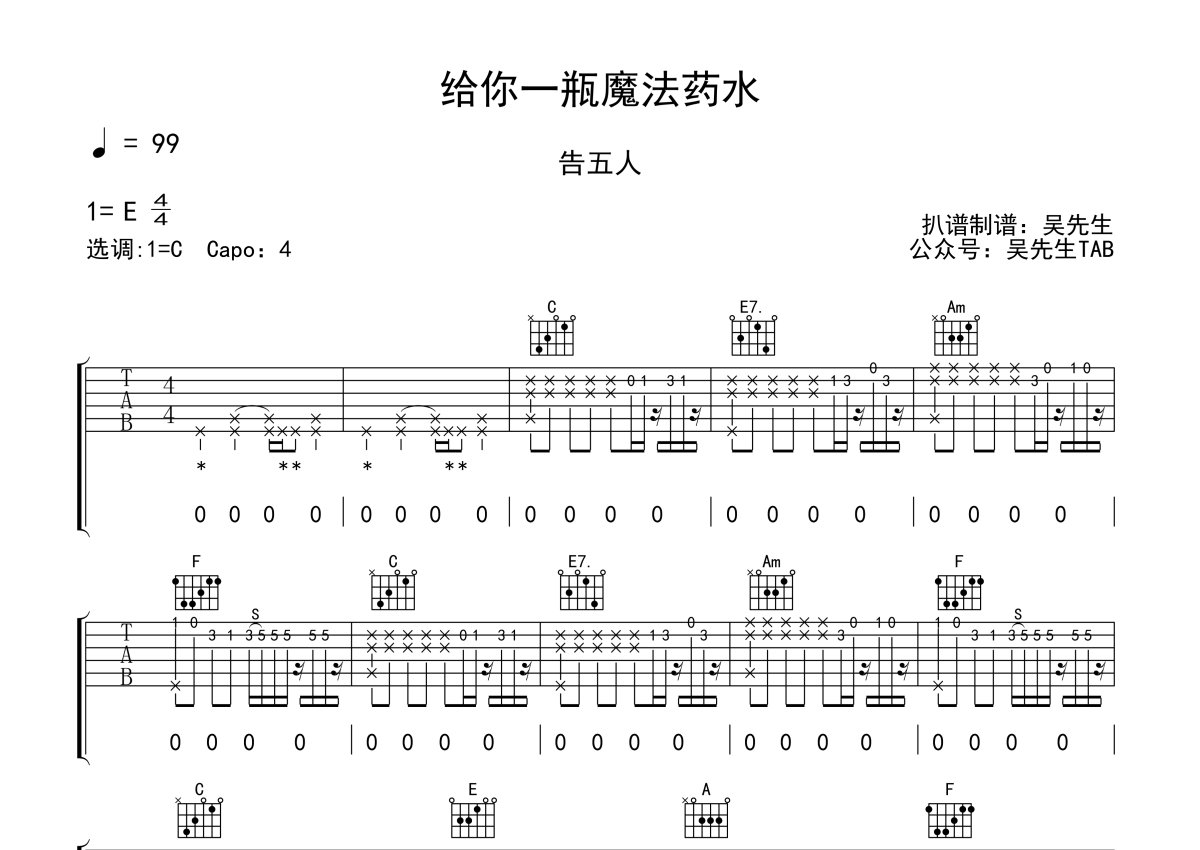 《给你一瓶魔法药水》是告五人演唱的一首歌曲,本吉他谱采用的是C调指法编配,这份吉他谱共有四张高清图谱,图谱由 @吴先生TAB 编配上传,图谱使用六线谱编配,包含吉他和弦指法、简谱以及歌词部分,使用这份给你一瓶魔法药水吉他谱,可以让你更加方便地掌握这首歌曲的弹唱技巧,快来尝试吧。告五人《给你一瓶魔法药水》吉他弹唱谱,采用C调指法编配,吴先生TAB编配出品,共有4张高清图谱。