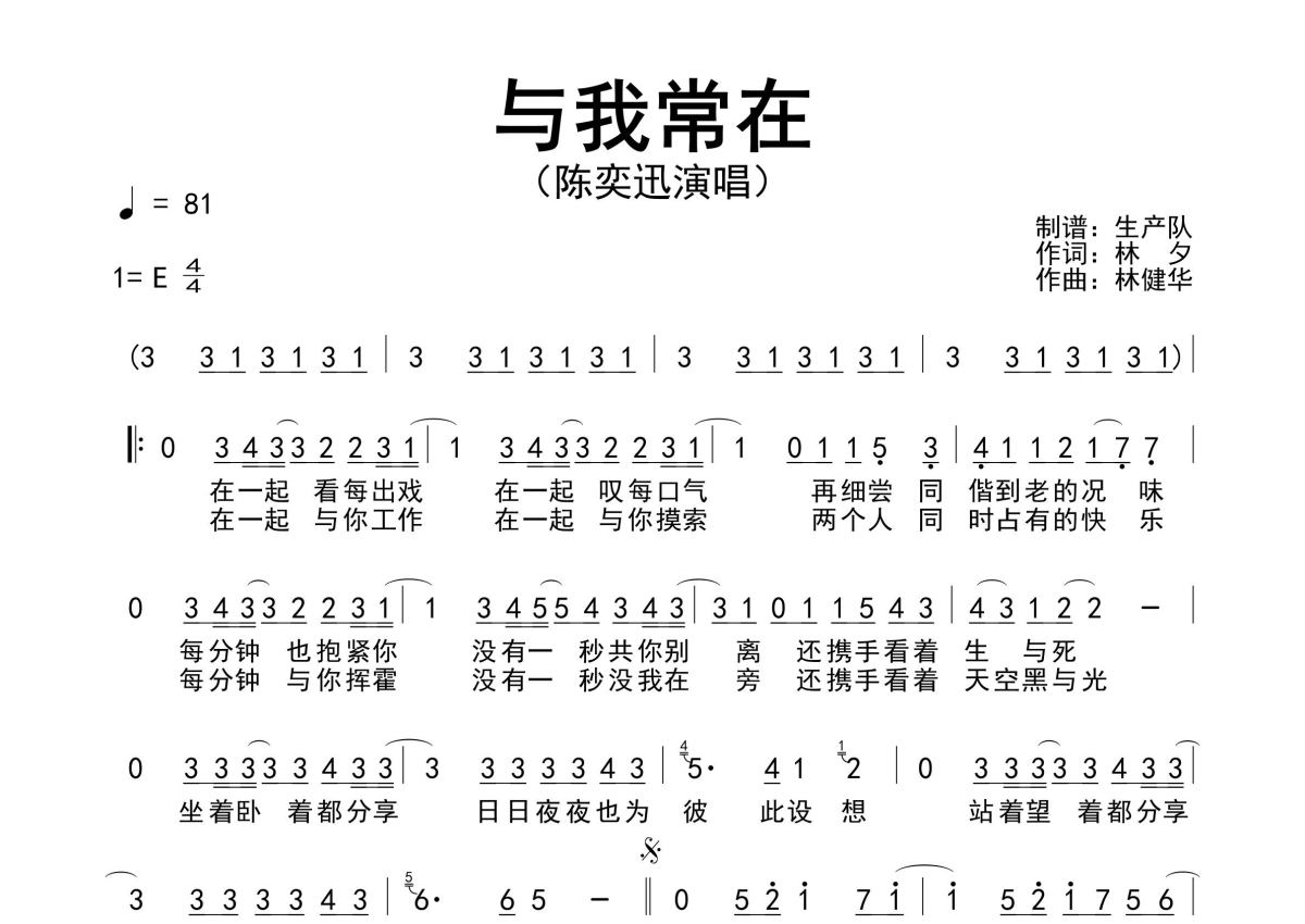 《与我常在》是陈奕迅演唱的一首歌曲,原版简谱,拍号为4/4拍,歌曲速度为每分钟81拍,这份简谱共有一张高清图谱,图谱由 @生产队 编配上传陈奕迅演唱的经典歌曲《与我常在》原版简谱,怀旧经典!。