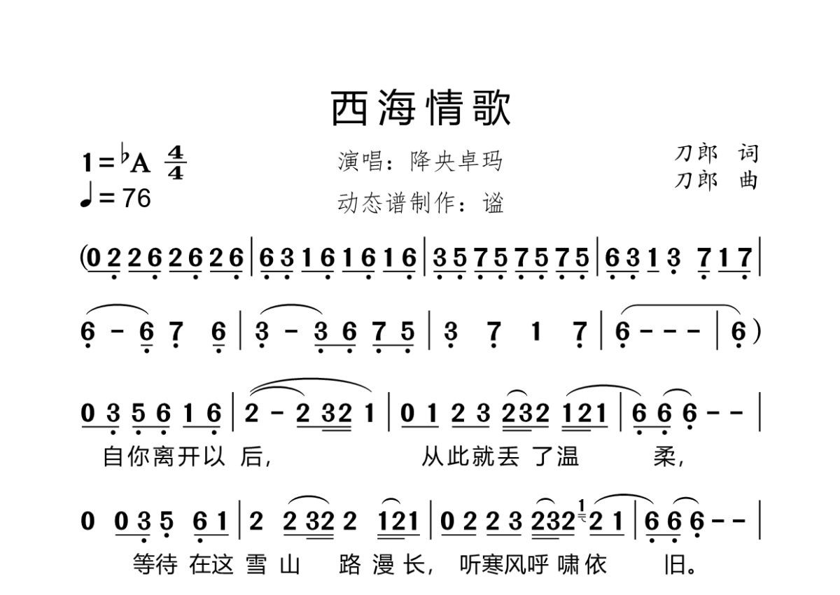 《西海情歌》是降央卓玛演唱的一首歌曲,拍号为4/4拍,歌曲速度为每分钟76拍,这份简谱共有两张高清图谱,图谱由 @谧 编配上传降央卓玛演唱的《西海情歌》,完整简谱,大字版,bA调,4/4拍,速度76,谧精心制谱,共2页。