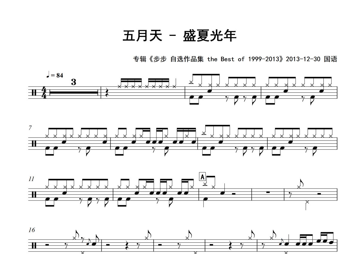 《盛夏光年》是五月天演唱的一首歌曲,专辑版,拍号为4/4拍,歌曲速度为每分钟84拍,这份架子鼓谱共有三张高清图谱,图谱由 @老虎不说谎 编配上传,图谱使用五线谱编配,使用这份盛夏光年架子鼓谱,你将能够轻松地敲打出这首五月天的盛夏光年,快来尝试吧。