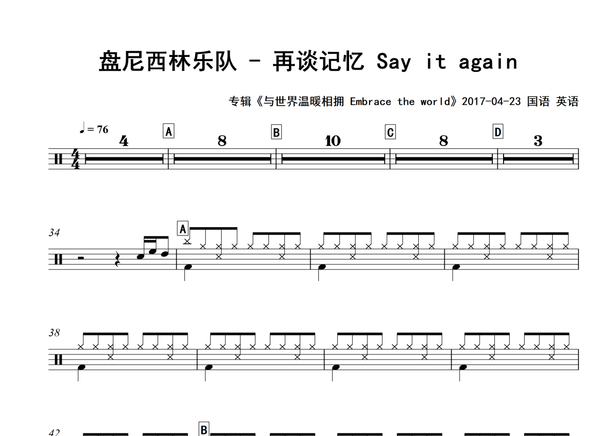 盘尼西林乐队《再谈记忆 Say it again》架子鼓谱 - 专辑版