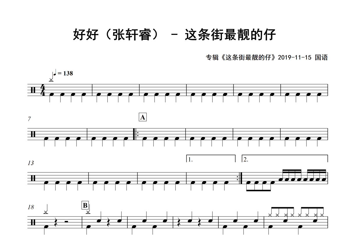 《这条街最靓的仔》是好好(张轩睿)演唱的一首歌曲,专辑版,拍号为4/4拍,歌曲速度为每分钟138拍,这份架子鼓谱共有两张高清图谱,图谱由 @积极处世 编配上传,图谱使用五线谱编配,使用这份这条街最靓的仔架子鼓谱,你将能够轻松地敲打出这首好好(张轩睿)的这条街最靓的仔,快来尝试吧。