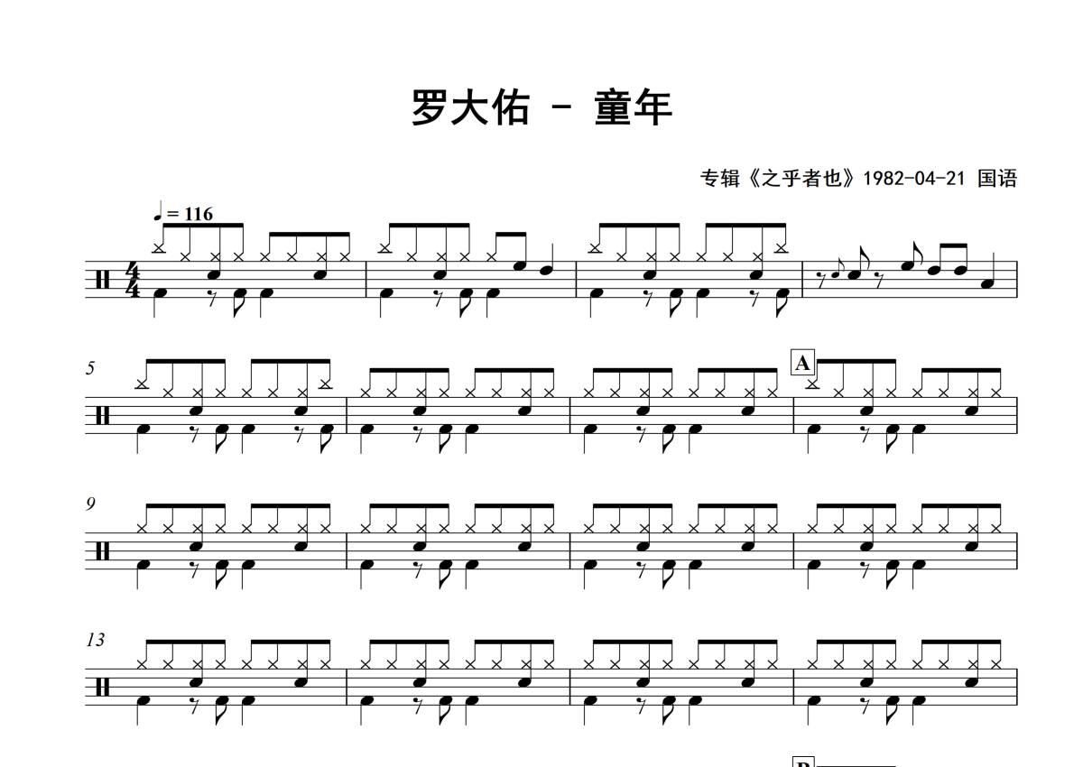 《童年》是罗大佑演唱的一首歌曲,专辑版,拍号为4/4拍,歌曲速度为每分钟116拍,这份架子鼓谱共有三张高清图谱,图谱由 @积极处世 编配上传,图谱使用五线谱编配,使用这份童年架子鼓谱,你将能够轻松地敲打出这首罗大佑的童年,快来尝试吧。