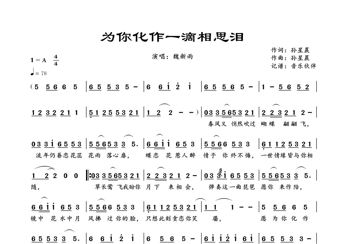 《为你化作一滴相思泪》是魏新雨演唱的一首歌曲,拍号为4/4拍,歌曲速度为每分钟78拍,这份简谱共有一张高清图谱,图谱由 @音乐伙伴 编配上传。