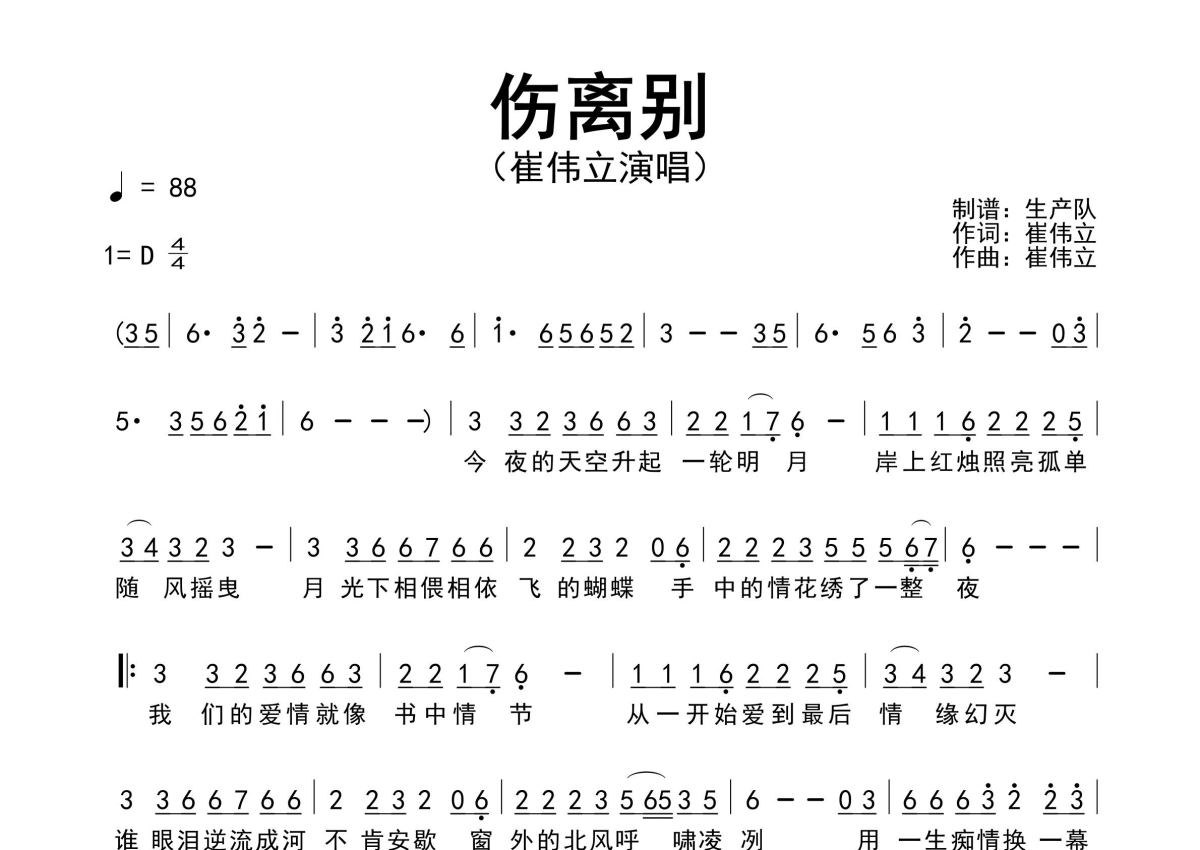 《伤离别》是崔伟立演唱的一首歌曲,原版简谱,拍号为4/4拍,歌曲速度为每分钟88拍,这份简谱共有一张高清图谱,图谱由 @生产队 编配上传崔伟立创作并演唱的歌曲《伤离别》原版简谱,精准的前奏、间奏solo编配。