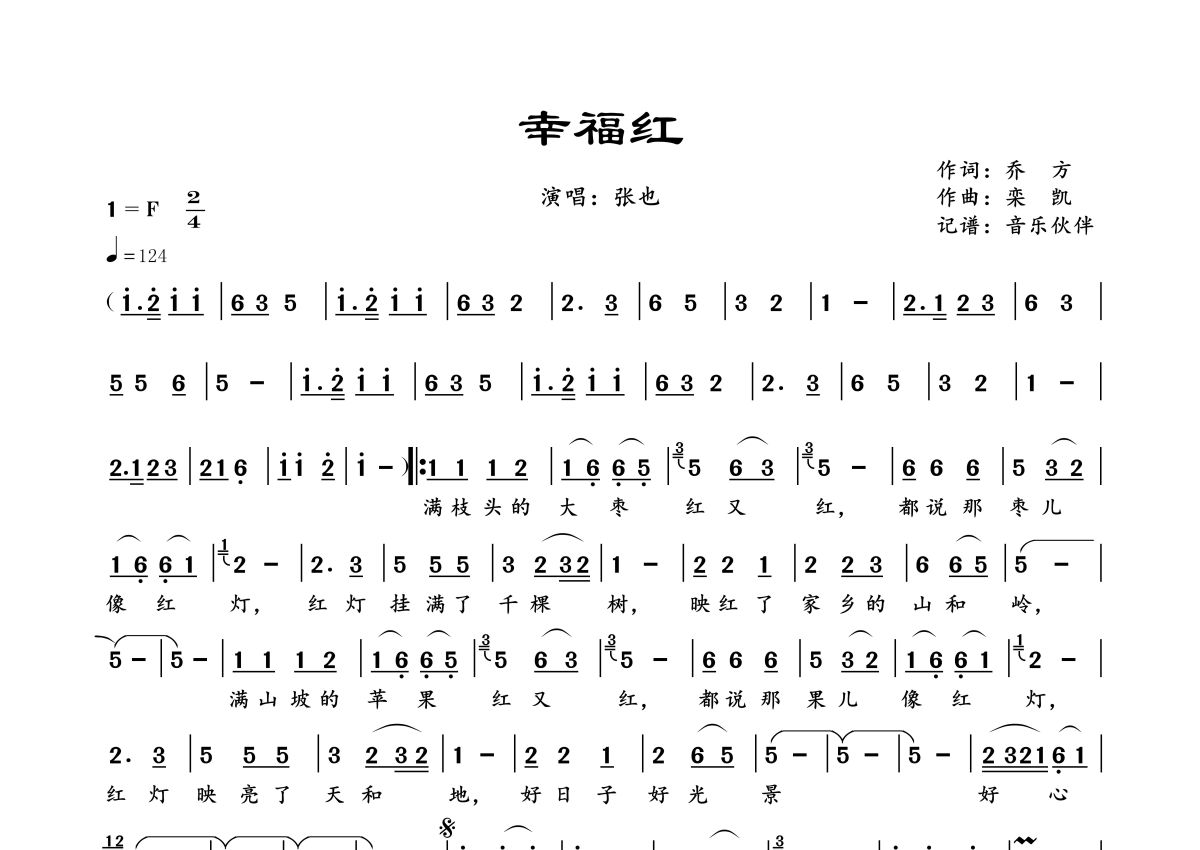 《幸福红》是张也演唱的一首歌曲,拍号为4/4拍,歌曲速度为每分钟124拍,这份简谱共有一张高清图谱,图谱由 @音乐伙伴 编配上传。