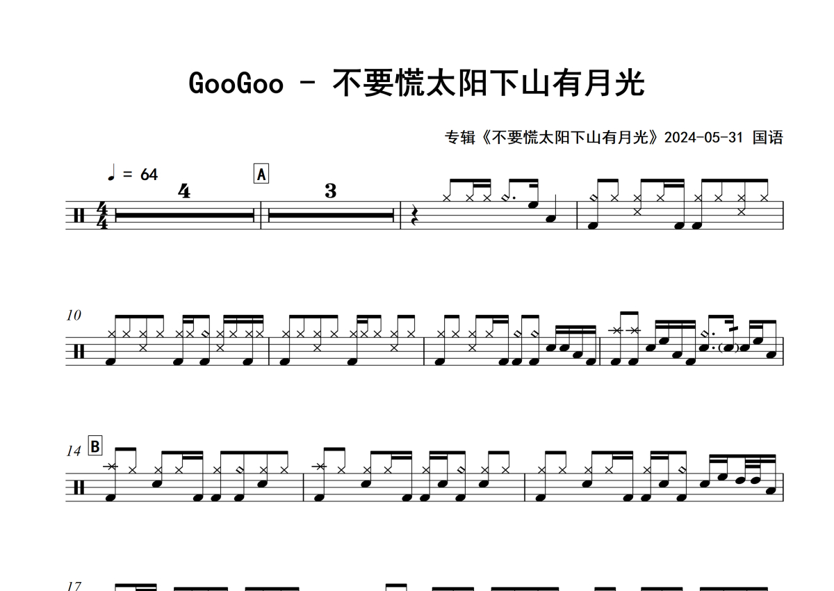 不要慌太阳下山有月光架子鼓谱 - GooGoo演唱 - 专辑版