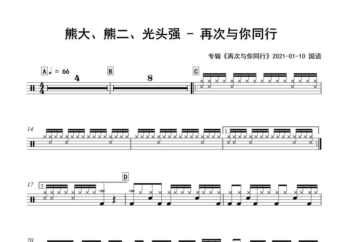 《再次与你同行》是熊大、熊二、光头强演唱的一首歌曲,专辑版,拍号为4/4拍,歌曲速度为每分钟66拍,这份架子鼓谱共有两张高清图谱,图谱由 @举个例子 编配上传,图谱使用五线谱编配,使用这份再次与你同行架子鼓谱,你将能够轻松地敲打出这首熊大、熊二、光头强的再次与你同行,快来尝试吧。