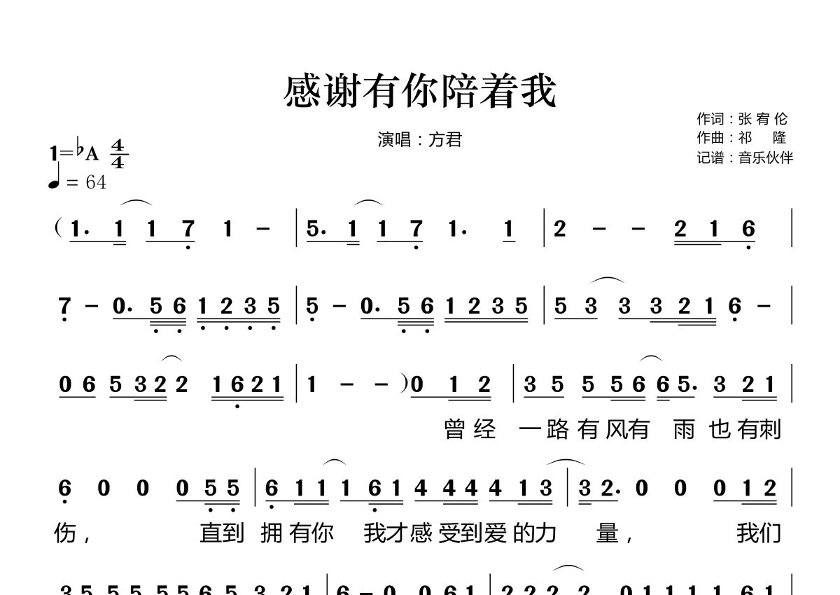 《感谢有你陪着我》是方君演唱的一首歌曲,拍号为4/4拍,歌曲速度为每分钟64拍,这份简谱共有两张高清图谱,图谱由 @音乐伙伴 编配上传。