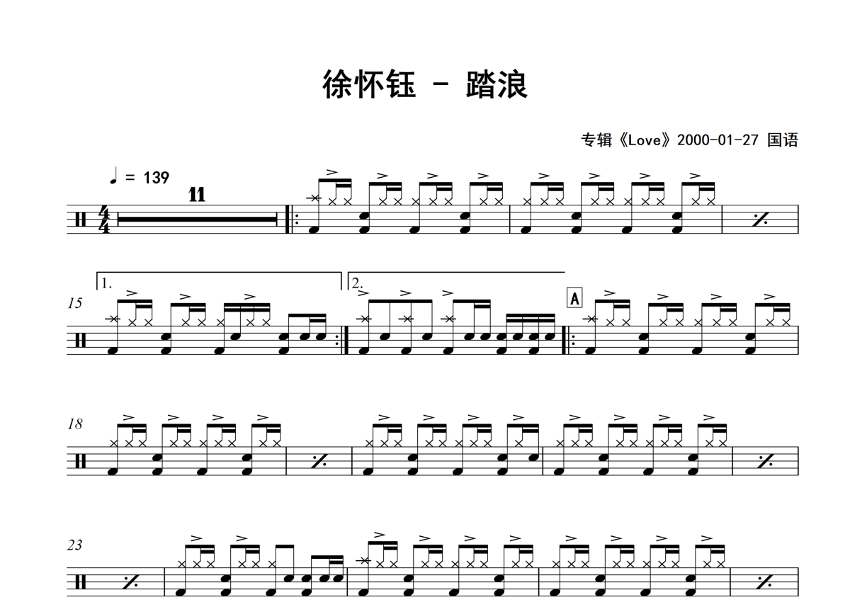 徐怀钰《踏浪》架子鼓谱 - 专辑版