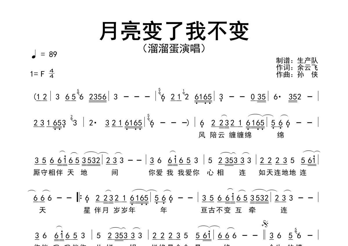 《月亮变了我不变》是溜溜蛋演唱的一首歌曲,原版简谱,拍号为4/4拍,歌曲速度为每分钟89拍,这份简谱共有一张高清图谱,图谱由 @生产队 编配上传溜溜蛋演唱的歌曲《月亮变了我不变》原版简谱,完整的前奏、间奏solo编配。