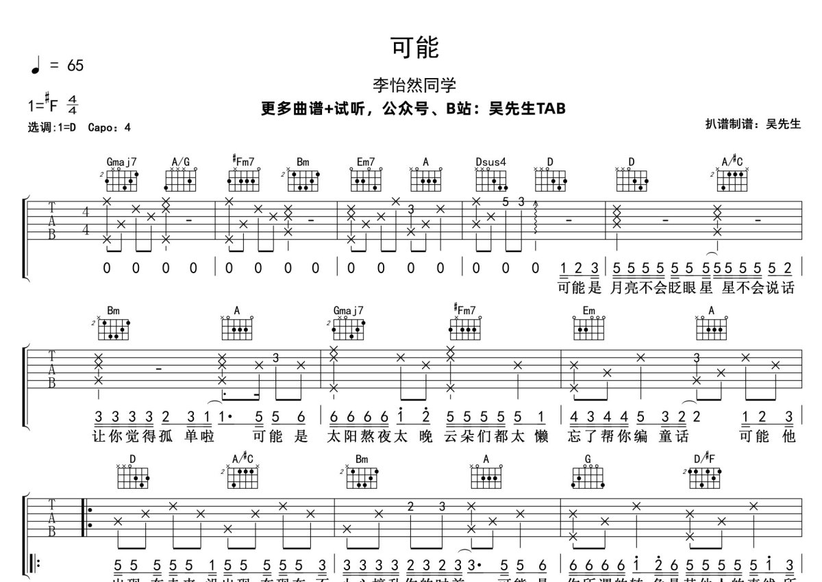 《可能》是李怡然同学演唱的一首歌曲,本吉他谱采用的是D调指法编配,这份吉他谱共有两张高清图谱,图谱由 @吴先生TAB 编配上传,图谱使用六线谱编配,包含吉他和弦指法、简谱以及歌词部分,曲谱配备了相关的音频提供试听,使用这份可能吉他谱,可以让你更加方便地掌握这首歌曲的弹唱技巧,快来尝试吧。李怡然同学《可能》吉他弹唱谱,采用D调指法编配,吴先生TAB编配出品,共有2张高清图谱,免翻页排版设计。