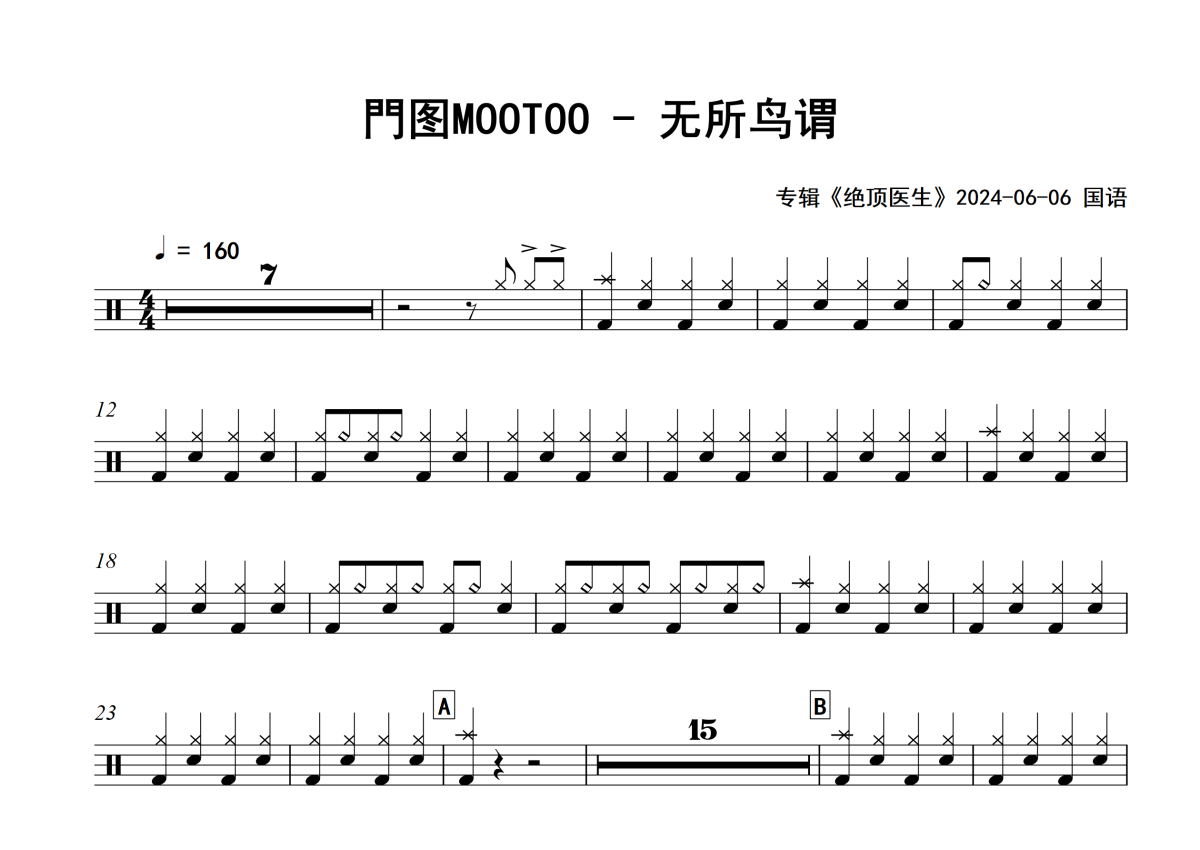《无所鸟谓》是門图MOOTOO演唱的一首歌曲,专辑版,拍号为4/4拍,歌曲速度为每分钟160拍,这份架子鼓谱共有两张高清图谱,图谱由 @举个例子 编配上传,图谱使用五线谱编配,使用这份无所鸟谓架子鼓谱,你将能够轻松地敲打出这首門图MOOTOO的无所鸟谓,快来尝试吧。
