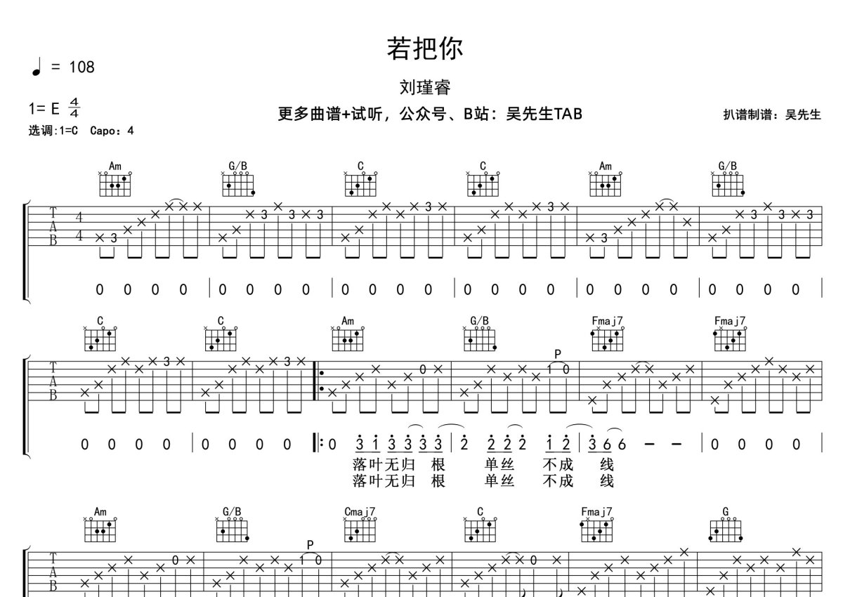 《若把你》是Kirsty刘瑾睿演唱的一首歌曲,本吉他谱采用的是C调指法编配,这份吉他谱共有两张高清图谱,图谱由 @吴先生TAB 编配上传,图谱使用六线谱编配,包含吉他和弦指法、简谱以及歌词部分,曲谱配备了相关的音频提供试听,使用这份若把你吉他谱,可以让你更加方便地掌握这首歌曲的弹唱技巧,快来尝试吧。Kirsty刘瑾睿《若把你》吉他弹唱谱,采用C调指法编配,吴先生TAB编配出品,共有2张高清图谱,免翻页排版设计。