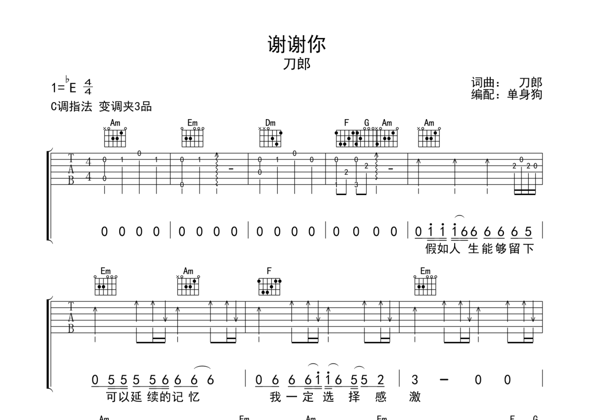 《谢谢你》是刀郎演唱的一首歌曲,拍号为4/4拍,歌曲原调为Eb调,但由于原调指法比较难,为了方便弹奏,本吉他谱采用的是C调指法编配,变调夹3品弹奏即为原调,当然也可以根据自己的音域改变变调夹位置,或者通过改变和弦调性,以方便自己弹奏,这份吉他谱共有四张高清图谱,图谱由 @单身狗 编配上传,图谱使用六线谱编配,包含吉他和弦指法、简谱以及歌词部分,使用这份谢谢你吉他谱,可以让你更加方便地掌握这首歌曲的弹唱技巧,快来尝试吧。