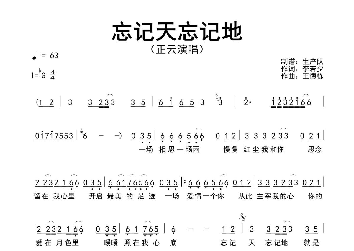 《忘记天忘记地》是正云演唱的一首歌曲,原版简谱,拍号为4/4拍,歌曲速度为每分钟63拍,这份简谱共有一张高清图谱,图谱由 @生产队 编配上传正云演唱的歌曲《忘记天忘记地》原版简谱,精准的前奏、间奏、尾奏solo编配 。