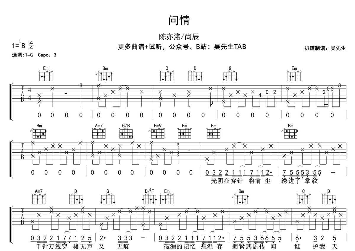 《问情》是陈亦洺 / 尚辰演唱的一首歌曲,本吉他谱采用的是G调指法编配,这份吉他谱共有两张高清图谱,图谱由 @吴先生TAB 编配上传,图谱使用六线谱编配,包含吉他和弦指法、简谱以及歌词部分,曲谱配备了相关的音频提供试听,使用这份问情吉他谱,可以让你更加方便地掌握这首歌曲的弹唱技巧,快来尝试吧。陈亦洺/尚辰《问情》吉他弹唱谱,采用G调指法编配,吴先生TAB编配出品,共有2张高清图谱,免翻页排版设计。