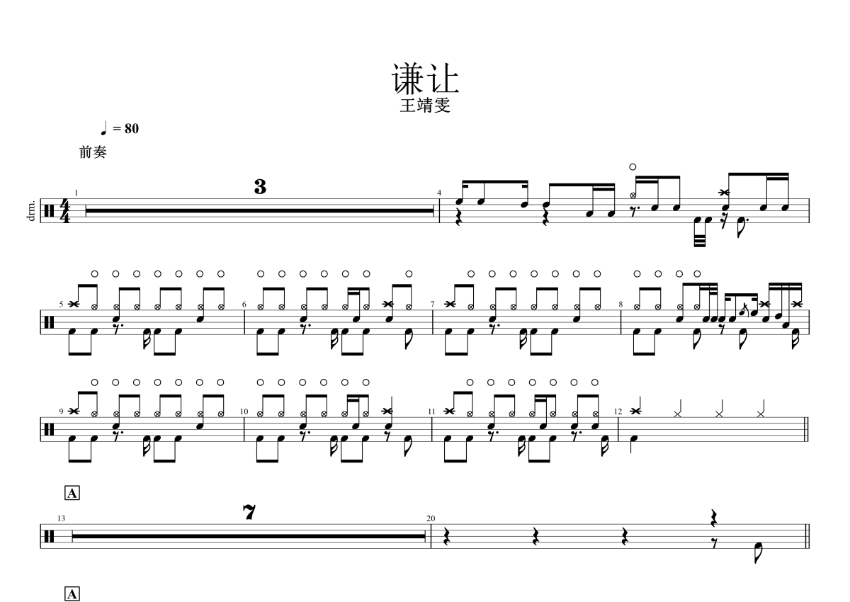 《谦让》是王靖雯演唱的一首歌曲,这份架子鼓谱共有三张高清图谱,图谱由 @小东鼓谱 编配上传,图谱使用五线谱编配,使用这份谦让架子鼓谱,你将能够轻松地敲打出这首王靖雯的谦让,快来尝试吧。