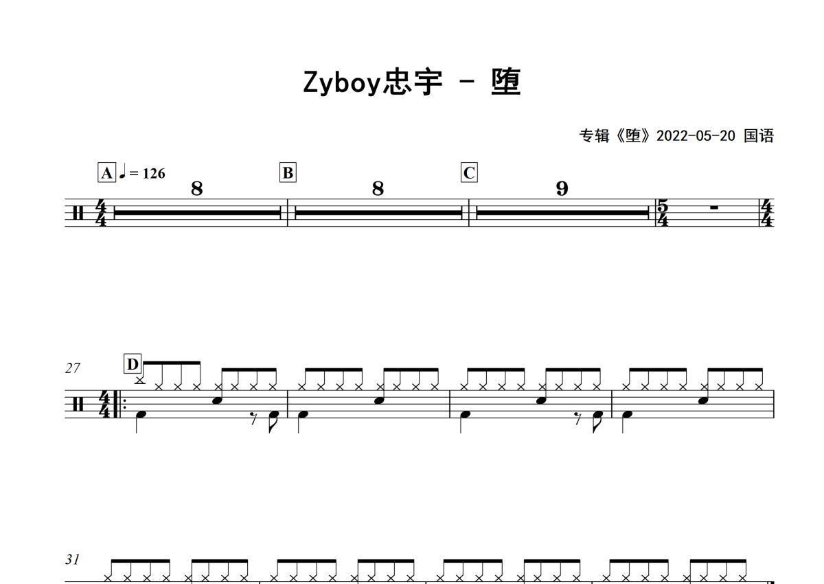 Zyboy忠宇《堕》架子鼓谱 - 专辑版