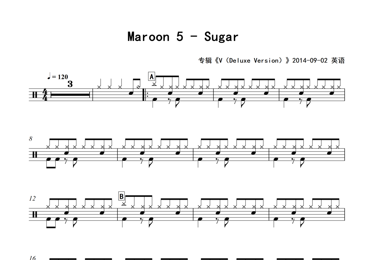 Maroon 5《Sugar》架子鼓谱 - 专辑版