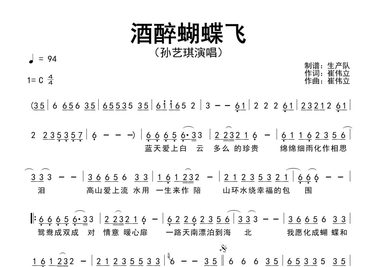 《酒醉蝴蝶飞》是孙艺琪演唱的一首歌曲,原版简谱,拍号为4/4拍,歌曲速度为每分钟94拍,这份简谱共有一张高清图谱,图谱由 @生产队 编配上传孙艺琪演唱的歌曲《酒醉蝴蝶飞》原版简谱,精准的前奏、间奏、尾奏solo编配。