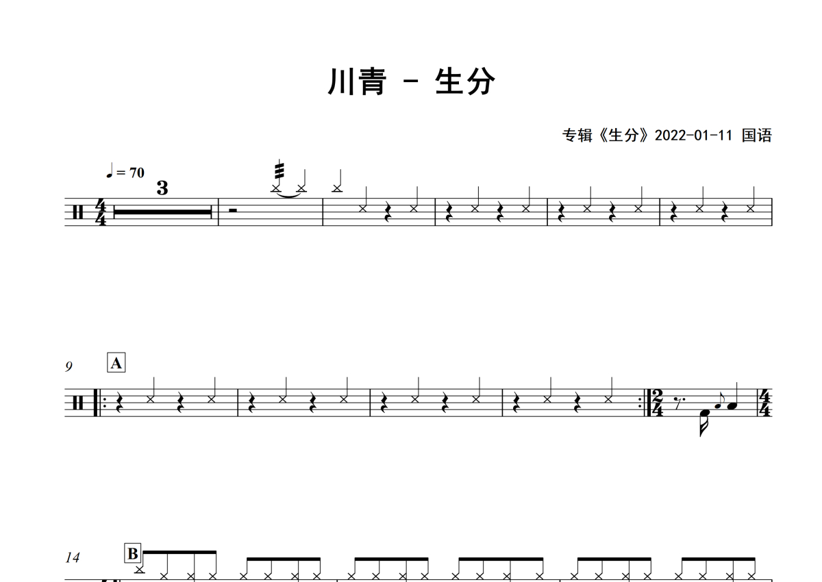 《生分》是川青演唱的一首歌曲,专辑版,拍号为4/4拍,歌曲速度为每分钟70拍,这份架子鼓谱共有两张高清图谱,图谱由 @积极处世 编配上传,图谱使用五线谱编配,使用这份生分架子鼓谱,你将能够轻松地敲打出这首川青的生分,快来尝试吧。