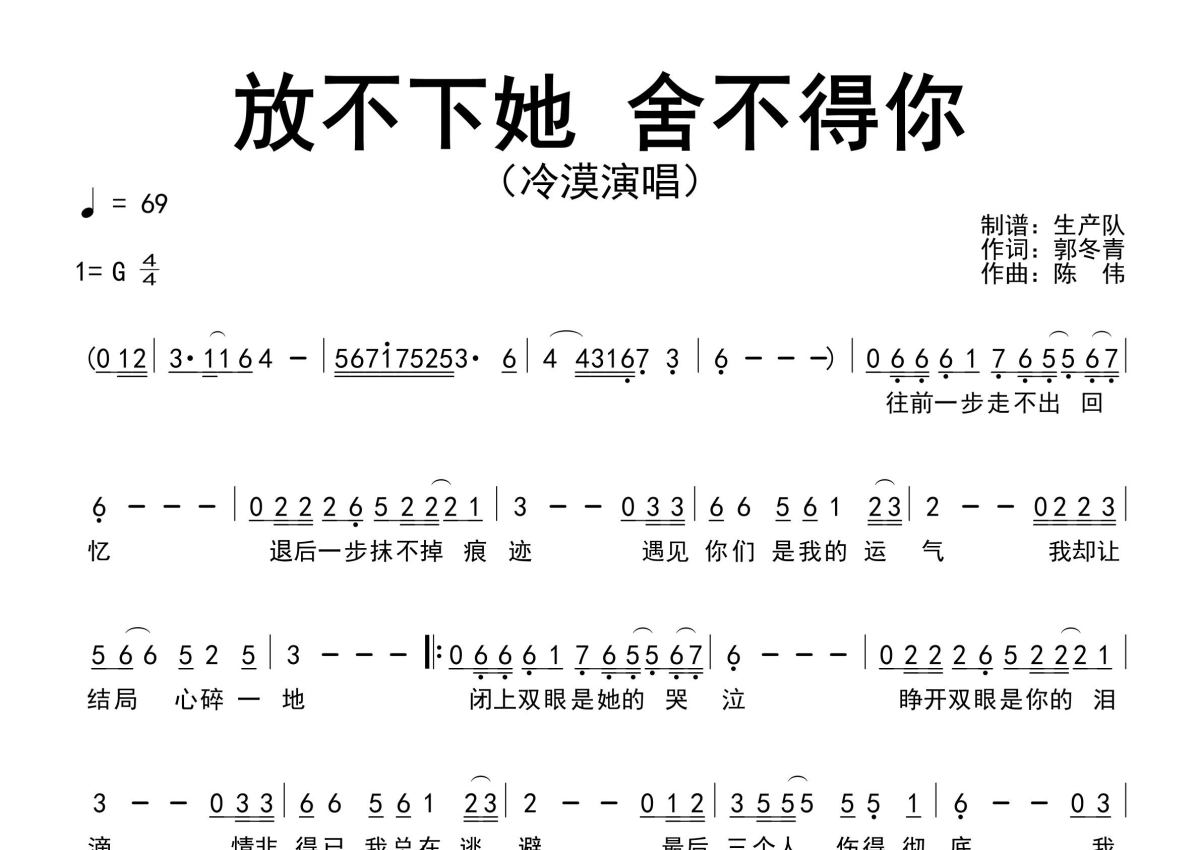 《放不下她 舍不得你》是冷漠演唱的一首歌曲,原版简谱,拍号为4/4拍,歌曲速度为每分钟69拍,这份简谱共有一张高清图谱,图谱由 @生产队 编配上传冷漠演唱的歌曲《放不下她 舍不得你》原版简谱,精准的前奏、间奏solo编配。我放不下她,又舍不得你,爱情并不是一道选择题,千言万语不知从何说起,只有默默的说声对不起。