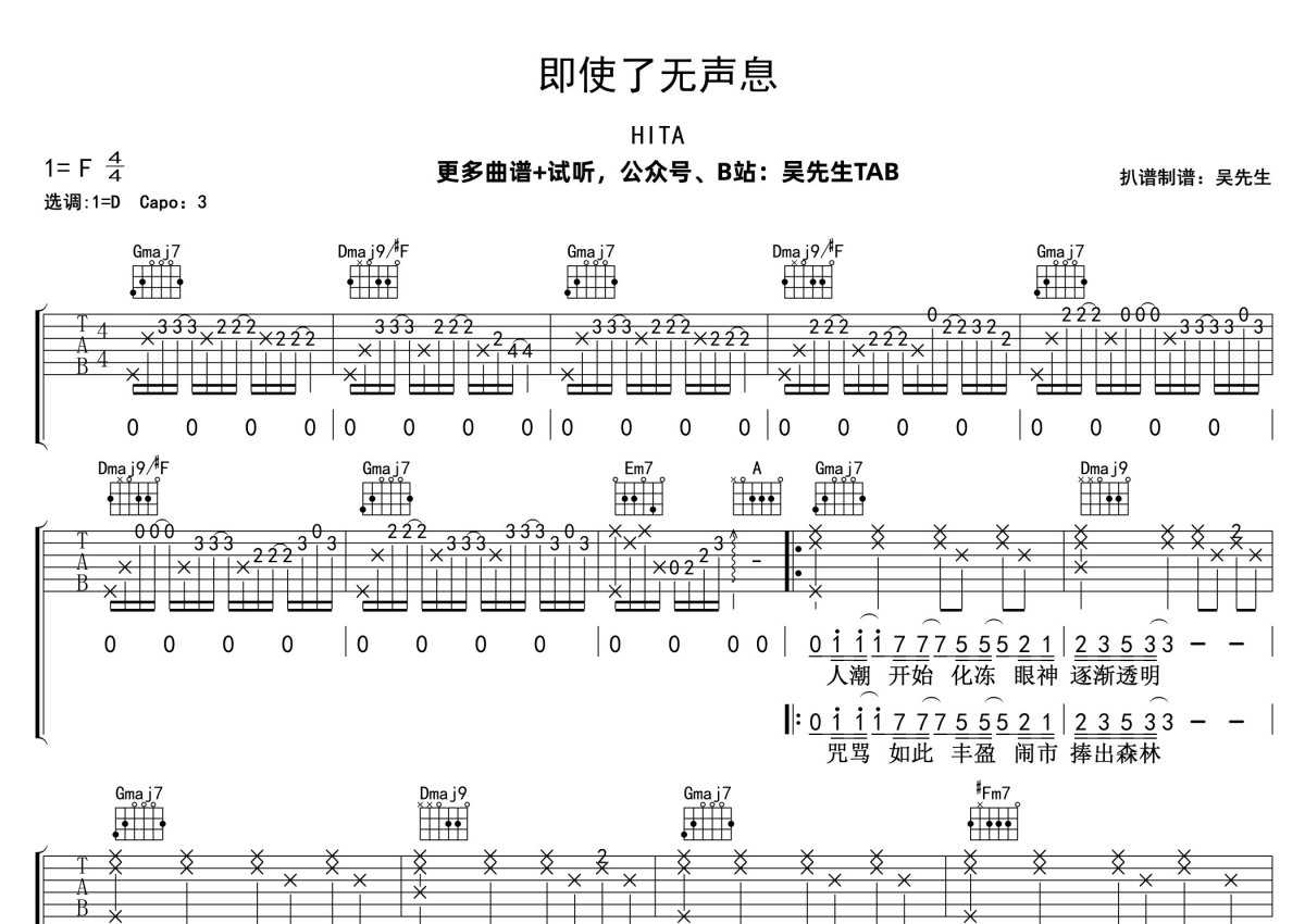 《即使了无声息》是HITA演唱的一首歌曲,本吉他谱采用的是D调指法编配,这份吉他谱共有两张高清图谱,图谱由 @吴先生TAB 编配上传,图谱使用六线谱编配,包含吉他和弦指法、简谱以及歌词部分,曲谱配备了相关的音频提供试听,使用这份即使了无声息吉他谱,可以让你更加方便地掌握这首歌曲的弹唱技巧,快来尝试吧。HITA《即使了无声息》吉他弹唱谱,采用D调指法编配,吴先生TAB编配出品,共有2张高清图谱,免翻页排版设计。