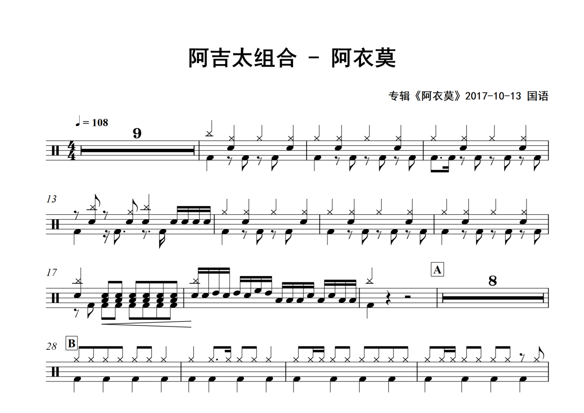 《阿衣莫》是阿吉太组合演唱的一首歌曲,专辑版,拍号为4/4拍,歌曲速度为每分钟108拍,这份架子鼓谱共有三张高清图谱,图谱由 @积极处世 编配上传,图谱使用五线谱编配,使用这份阿衣莫架子鼓谱,你将能够轻松地敲打出这首阿吉太组合的阿衣莫,快来尝试吧。