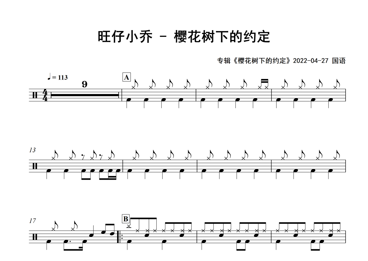 《樱花树下的约定》是旺仔小乔演唱的一首歌曲,专辑版,拍号为4/4拍,歌曲速度为每分钟113拍,这份架子鼓谱共有两张高清图谱,图谱由 @积极处世 编配上传,图谱使用五线谱编配,使用这份樱花树下的约定架子鼓谱,你将能够轻松地敲打出这首旺仔小乔的樱花树下的约定,快来尝试吧。